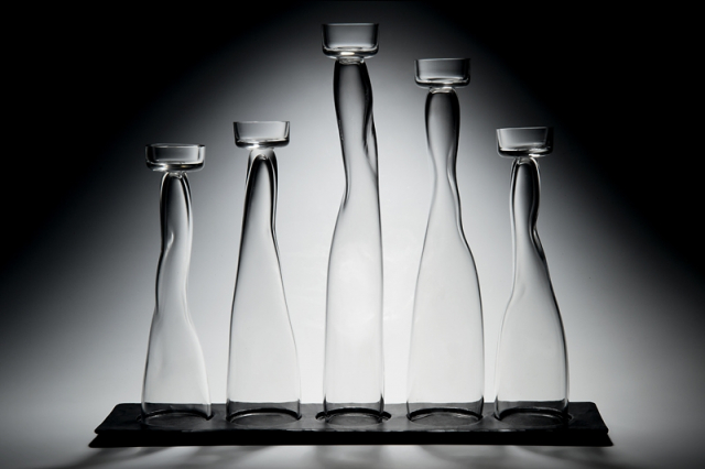 Always a challenging prospect in terms of weight and proportion, in the efforts to get both just right, each glass is hand-made and available individually or in groupings, with or without the cast black trays that are employed towards visual display. “Have nothing in your house that you do not know to be useful, or believe to be beautiful” said William Morris. With craftsmanship very much to the fore, why hide them away in a cupboard?